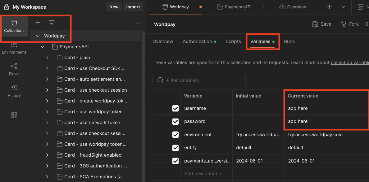 Download the postman collection above and import ![]() ![]() | To set your Try (test) username and password go to the variables section under the top FraudSight folder